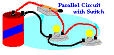 will work differently. Remember the two lights we connected in series? The switch turned off both lights but when they were On they were both dim. With a Parallel Circuit they both receive the full voltage and are bright. |