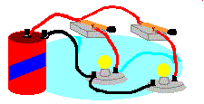 second light bulb to the single light bulb we started with on the series circuit page. But notice now that the current that flows through the second bulb does not pass through the first. There are two current paths. |
