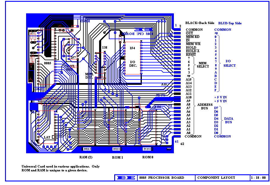 The Data Bus and Address Bus are fully decoded and available as an output from this board. The board itself has locations for two 2732 (4Kx8) EPROMS and a 6116 SRAM. These are assigned memory addresses; 0XXX, 1XXX, and 2XXX by default. Other address locations may be assigned off-card using the Address and Control Busses.