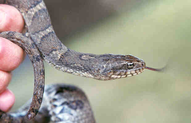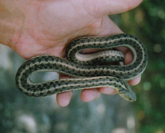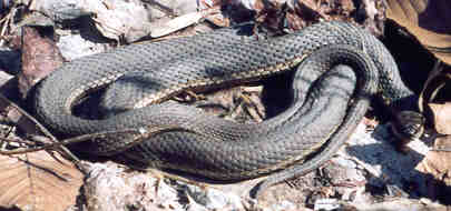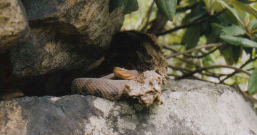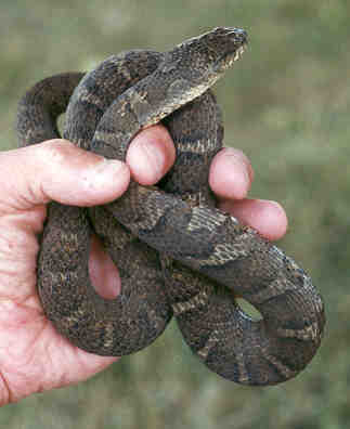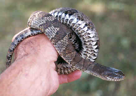 Northern Watersnake, this snake got a good bite on my hand that bled for a while. The saliva of the Northern Watersnake has anti-coagulant properties that causes a bite to bleed. These photos were taken after the snake had acclimated to me. June 19 99.