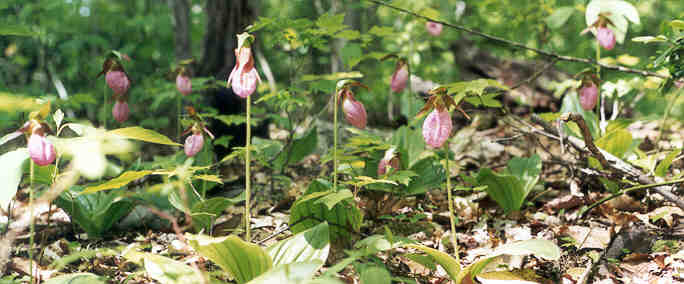 1 Pink Lady's Slipper Orchid | 2 Pink Lady's Slipper | many Pink Lady's Slipper | 1 Pink Lady's Slipper, May 21 99