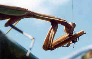 Praying Mantis eating a Yellow Jacket on a clothes line pole in our back yard. The Y. Jackets had a nest inside a pipe of the clothes line pole.