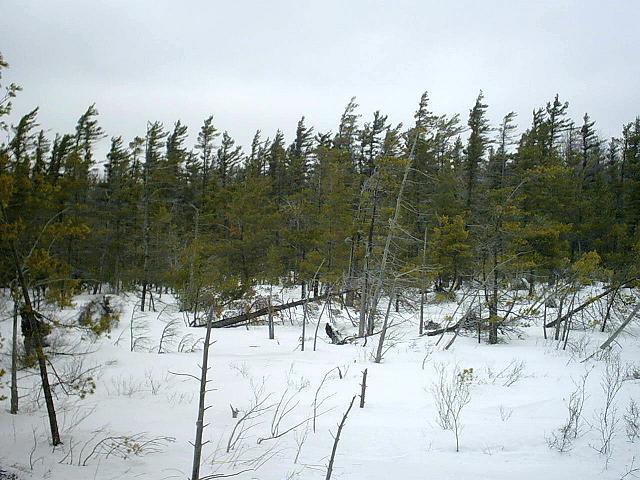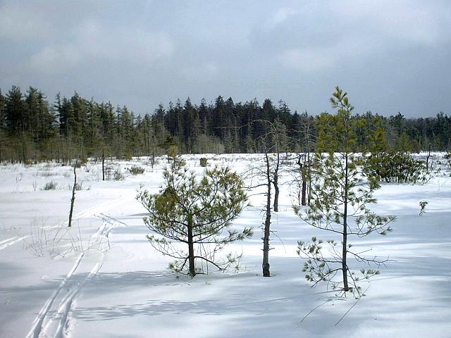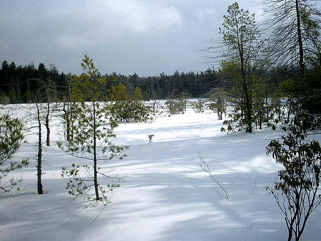 In Feb. 2004 Laurel Summit had a 15-20 inch snowpack with a hard surface crust. Walking was next to impossible, the crust would not support a persons weight. But cross country skis or snowshoes were perfect for moving on the crust. Spruce Flats Bog | Bog | Bog | Bog